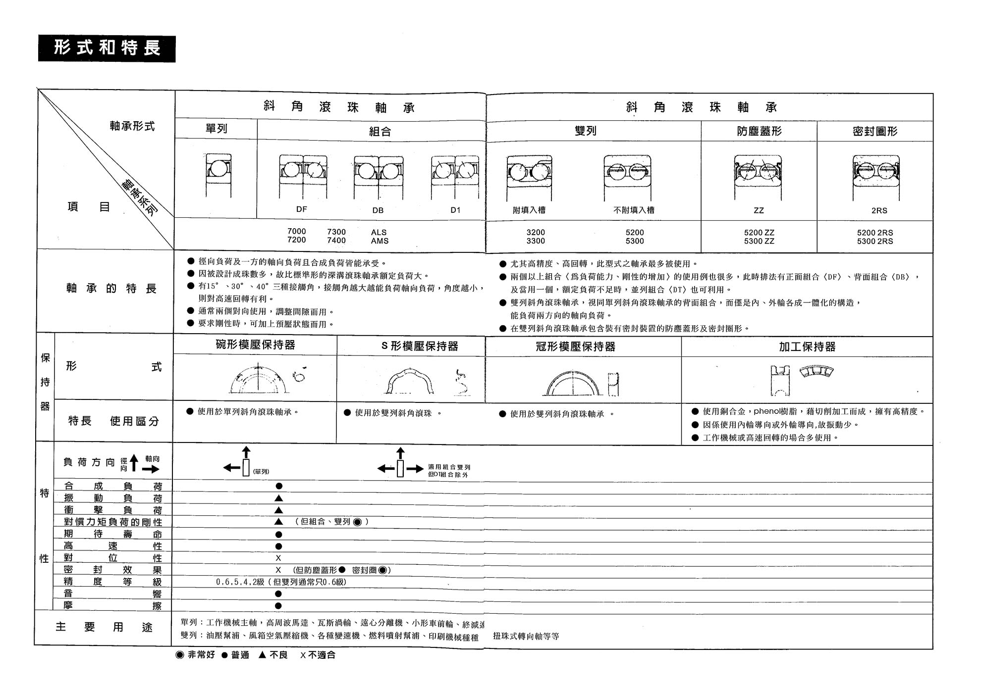 軸承之鋼珠與內輪及外輪在徑向方面是以某一個角度點來接觸,軸為非分離狀態,鋼珠數比深溝滾珠軸承還多。 保持架的材質為鋼板 高張力黃銅,或 程塑膠,視使用條件之不同選用。軸向荷重限於單一方向,但能承受軸向荷重及徑向荷重。 由於軸承,承受徑向荷重時會產生軸向分力,故一般均採用二個對向的組合。